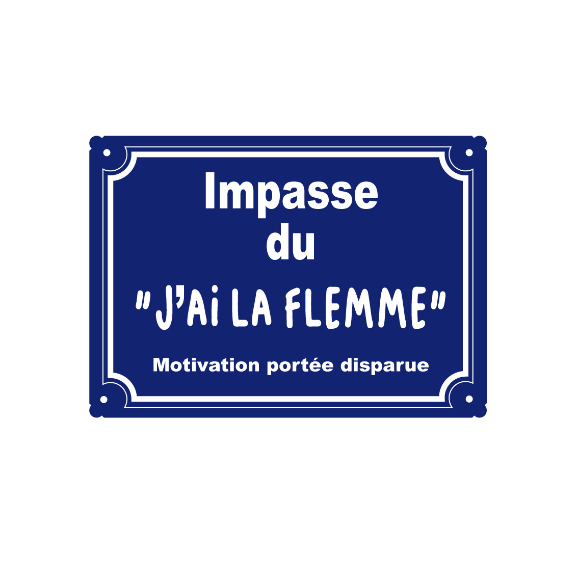 Plaque métal humoristique, Impasse du "j'ai la flemme". Motivation portée disparue.
