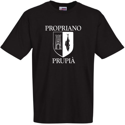 tee shirt noir avec symbole corse et écrit:"PROPRIANO PRUPIA" en blanc