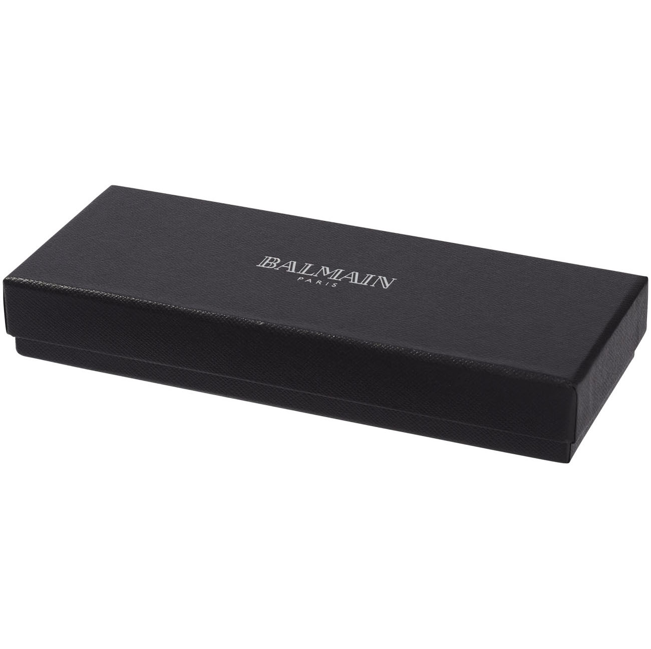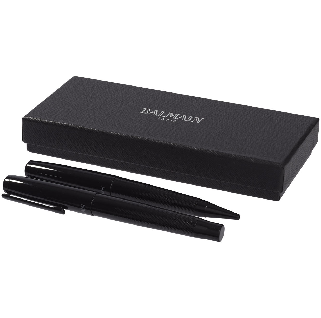 Parure au design exclusif contenant un stylo à bille et un roller dans un écrin cadeau en carton signé Balmain Gamme luxueuse idéal pour cadeau fête des pères, cadeau fête des mères, ou cadeau de noël.