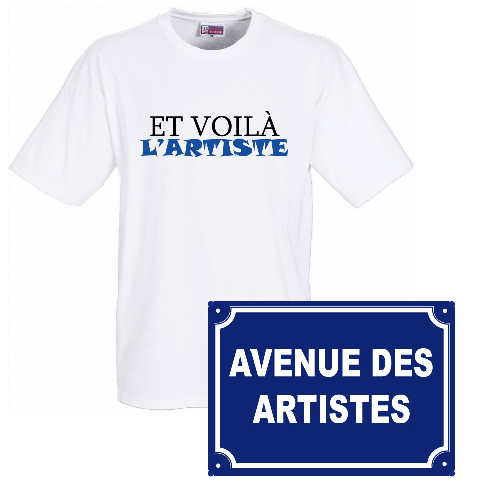 Ensemble Plaque de rue "Avenue des Artistes" et T-shirt blanc "Et voilà l'artiste"