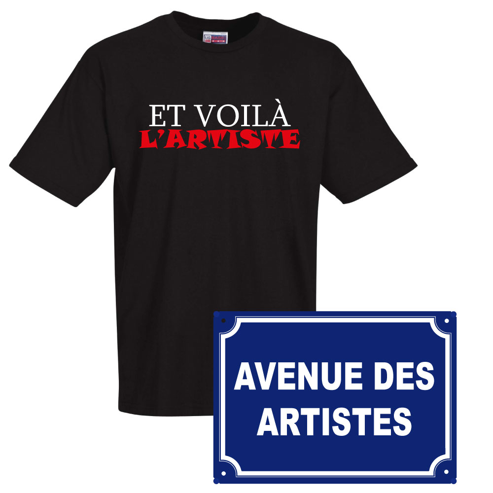 Ensemble Plaque de rue "Avenue des Artistes" et T-shirt noir "Et voilà l'artiste"