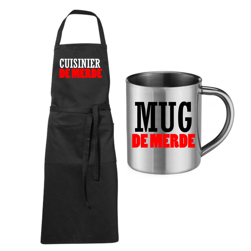 Ensemble tablier et mug "Cuisinier de merde" et "Mug de merde"