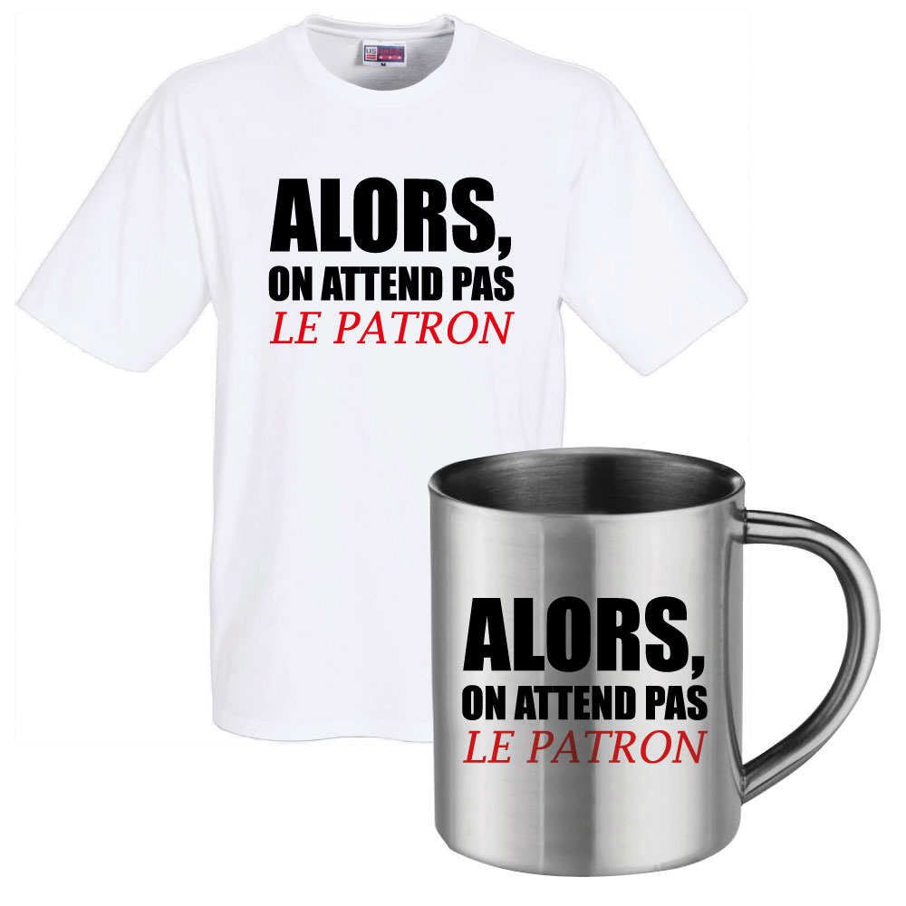 Ensemble T-shirt humoristique blanc "Alors on attend pas Le Patron" et mug inox
