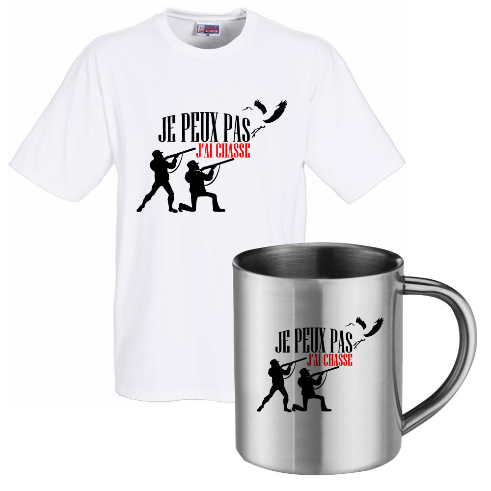 Ensemble T-shirt humoristique blanc " Je peux pas j'ai chasse " et mug inox