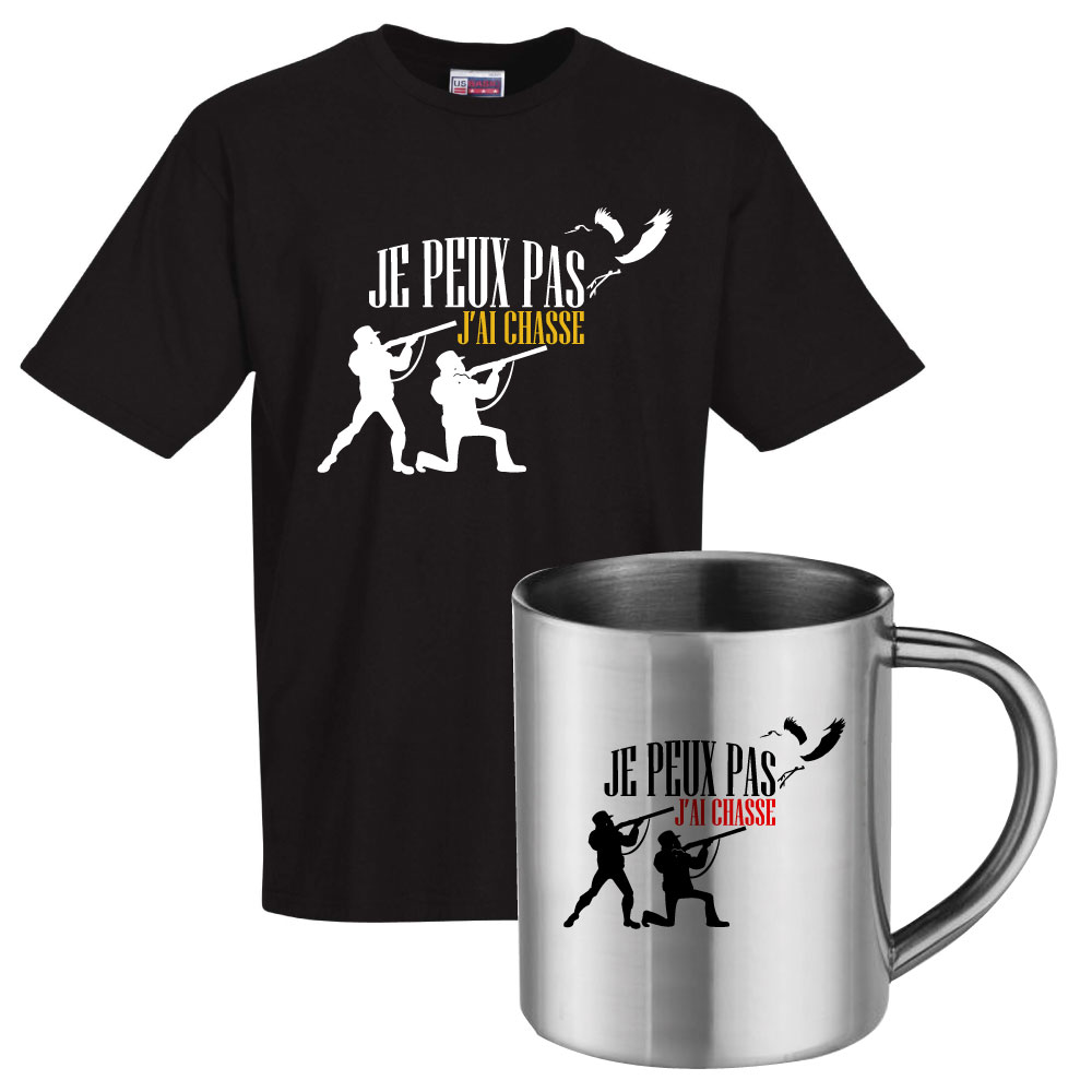 Ensemble T-shirt humoristique noir " Je peux pas j'ai chasse " et mug inox