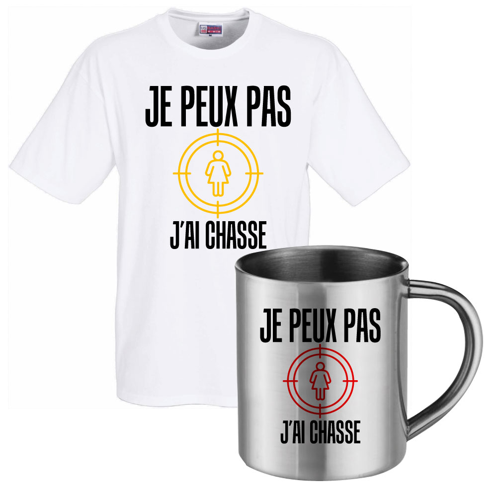 Ensemble T-shirt humoristique blanc " Je peux pas j'ai chasse " et mug inox en version chasseur de femme pour tout les dragueurs notoire.