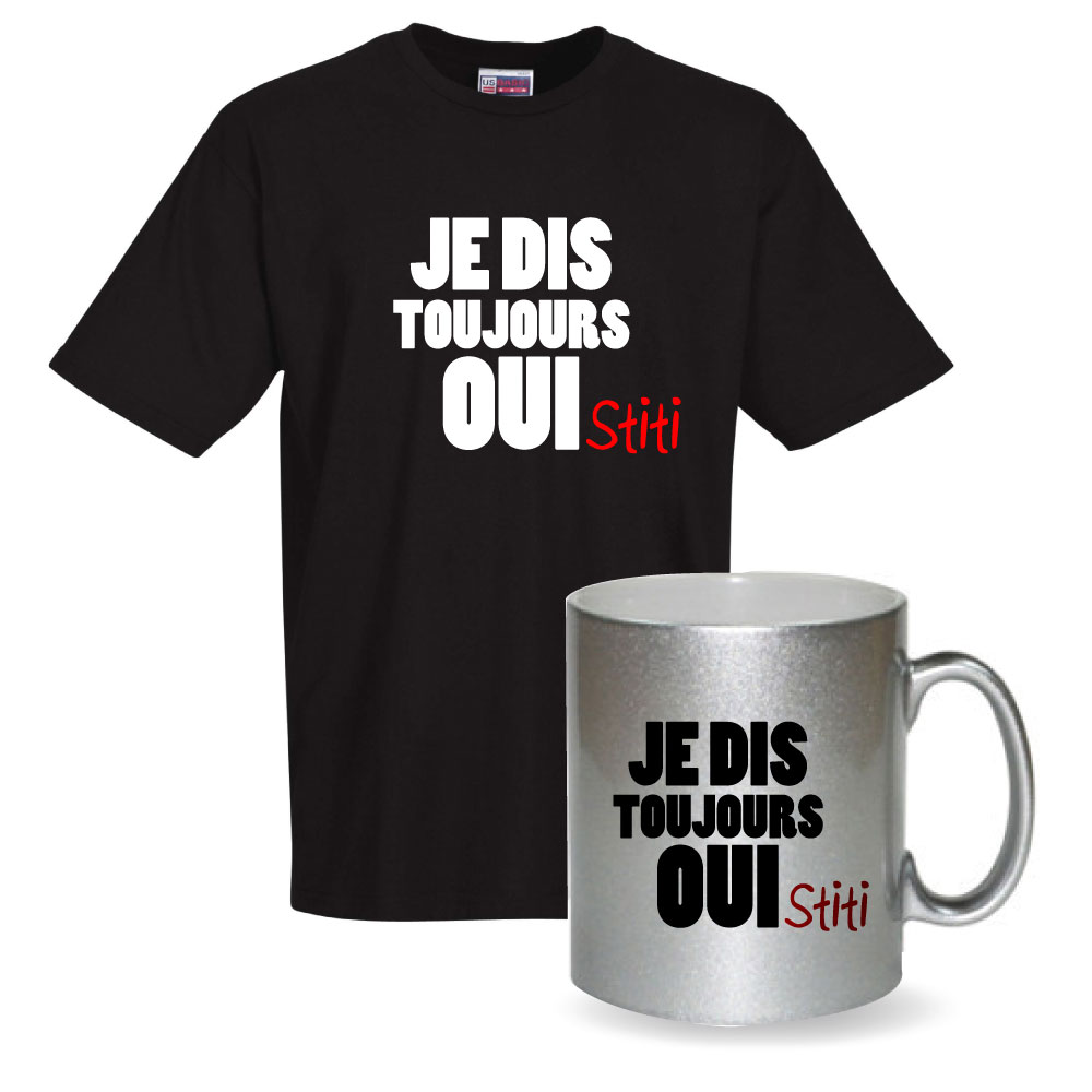 Ensemble T-shirt humoristique noir et mug pailleté Je dis toujours OUIstiti
