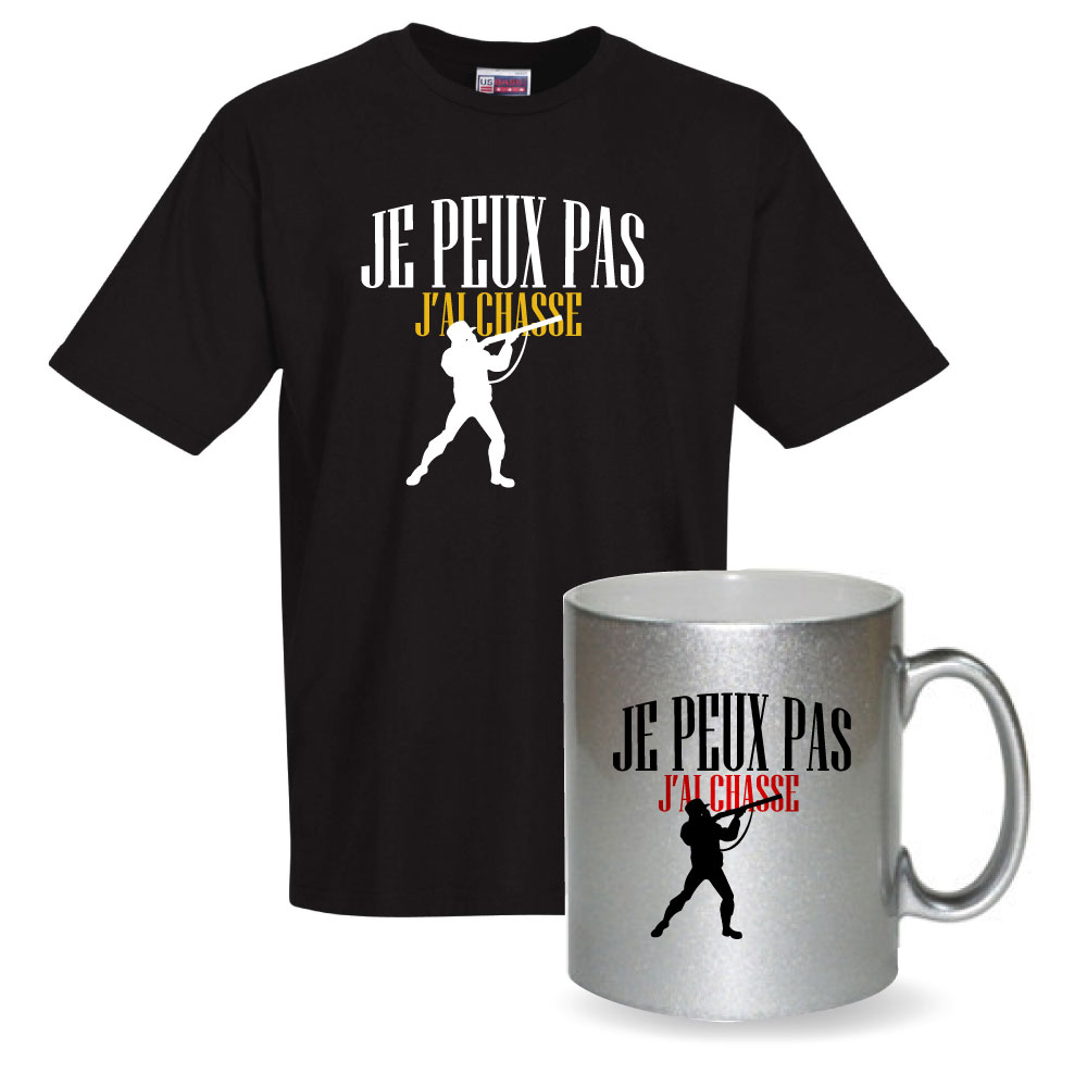Ensemble tee shirt noir et mug pailleté "Je peux pas j'ai chasse" modèle chasseur