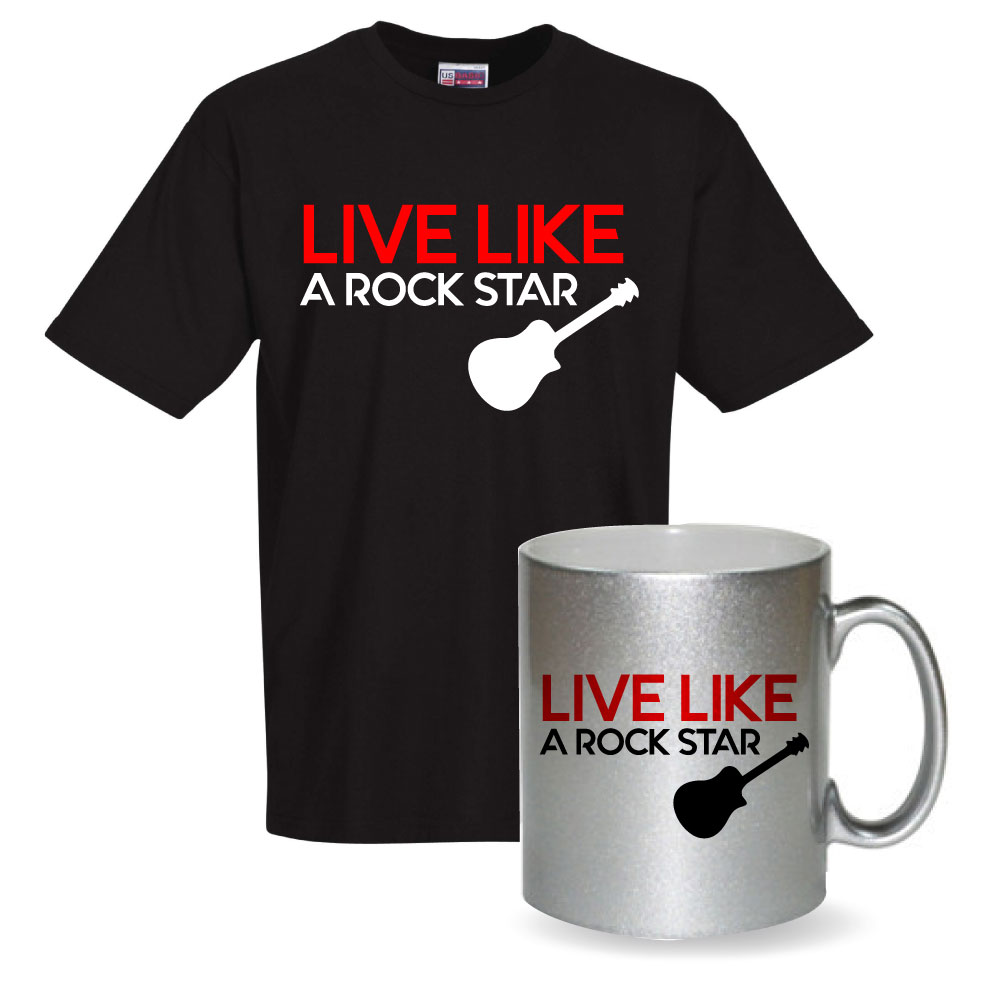 Ensemble Tshirt et mug Pailleté "LIVE LIKE A ROCK STAR"