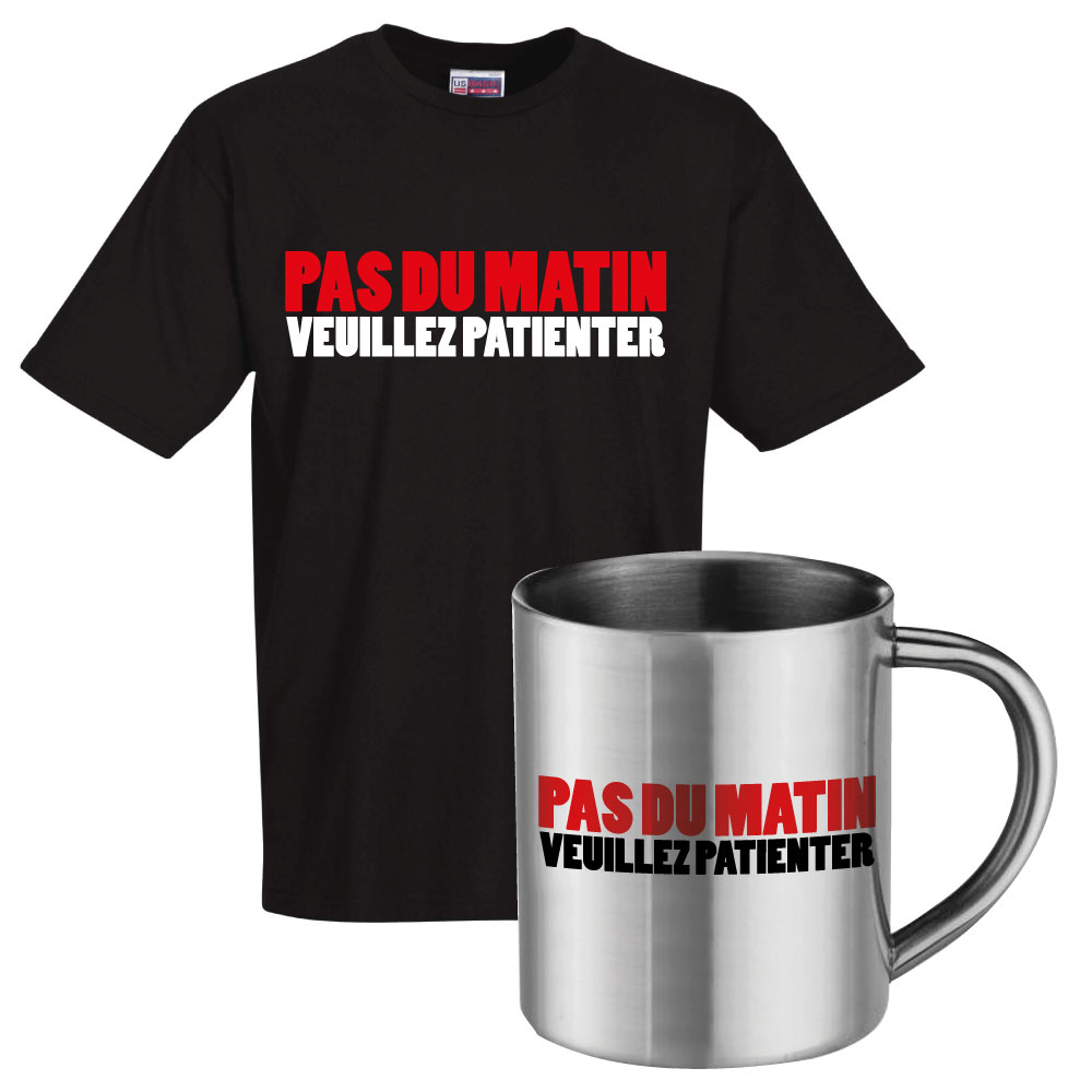 Ensemble T-shirt humoristique noir et mug inox "PAS DU MATIN VEUILLEZ PATIENTER"