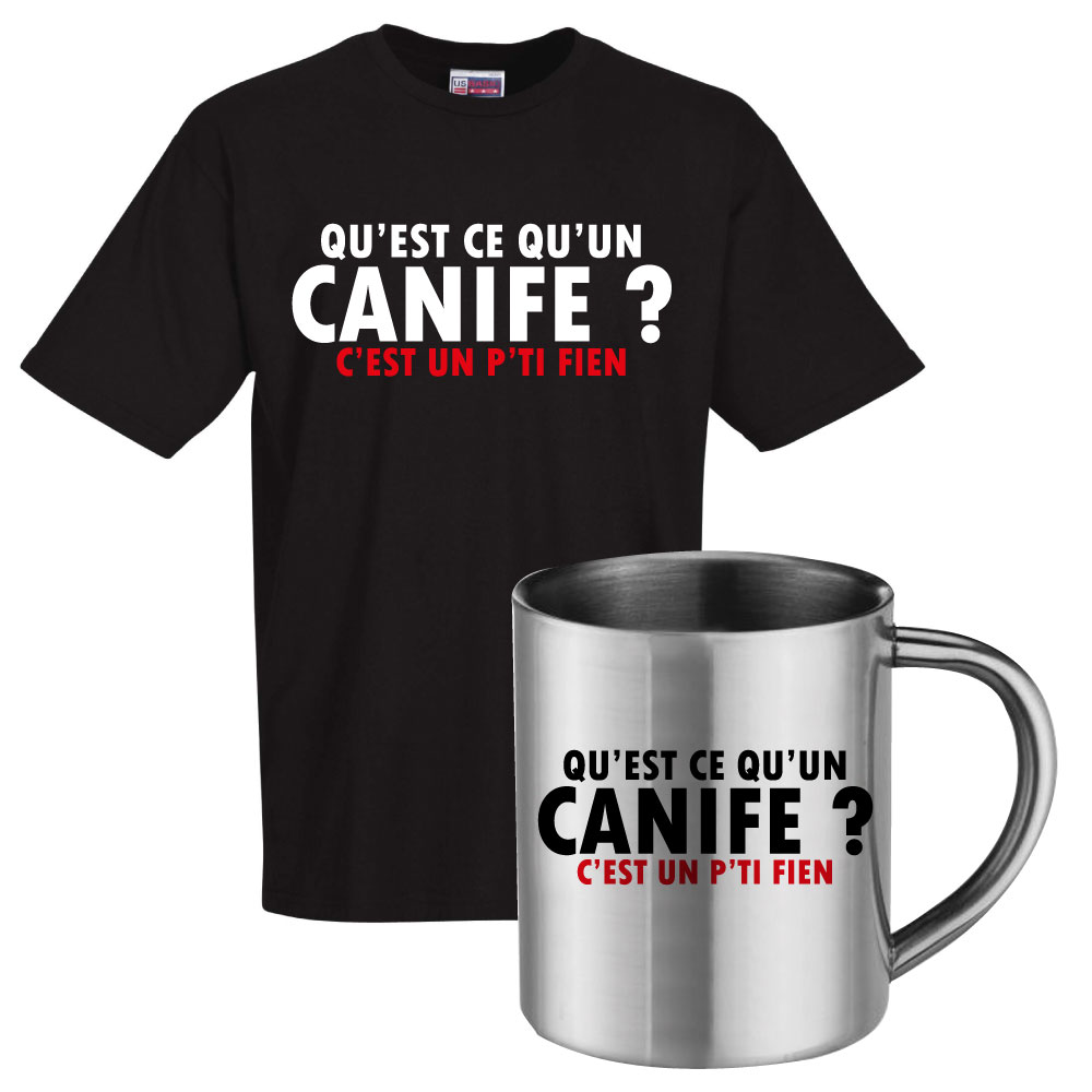 Ensemble tee shirt noir et mug "Qu'es qu'un Canife ? C'est un p'ti fien"