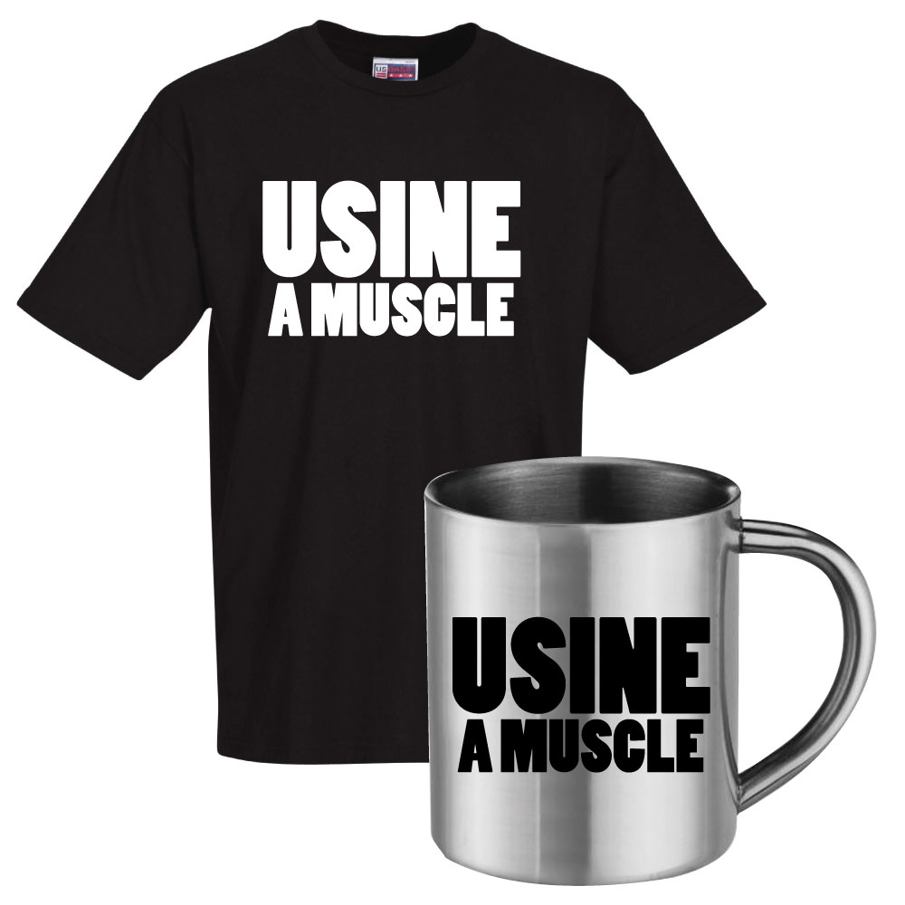 Ensemble tee shirt noir et mug inox "Usine à muscle"