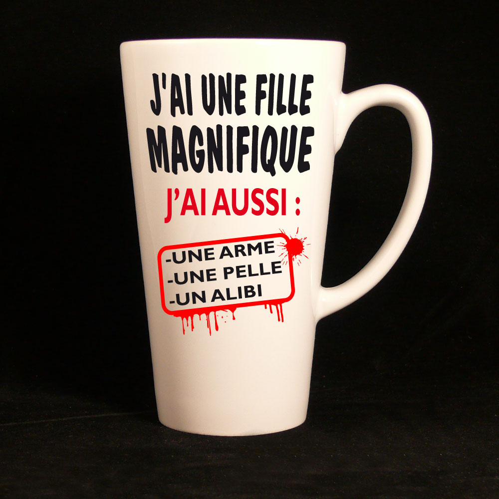 Grand Mug j'ai une fille magnifique, j'ai aussi une arme, une pelle et un alibi...