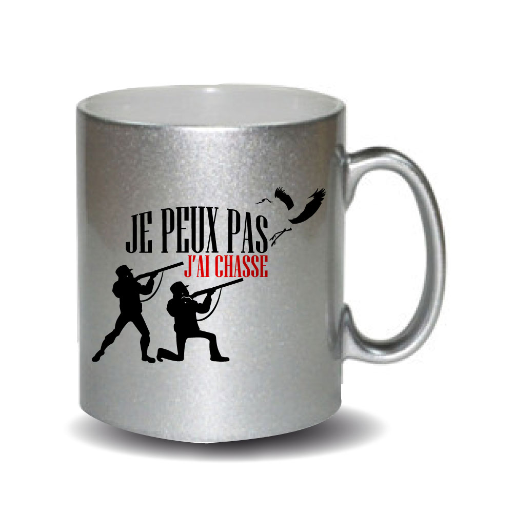 Mug humoristique Gris "Je peux pas j'ai chasse" modèle duo chasseurs