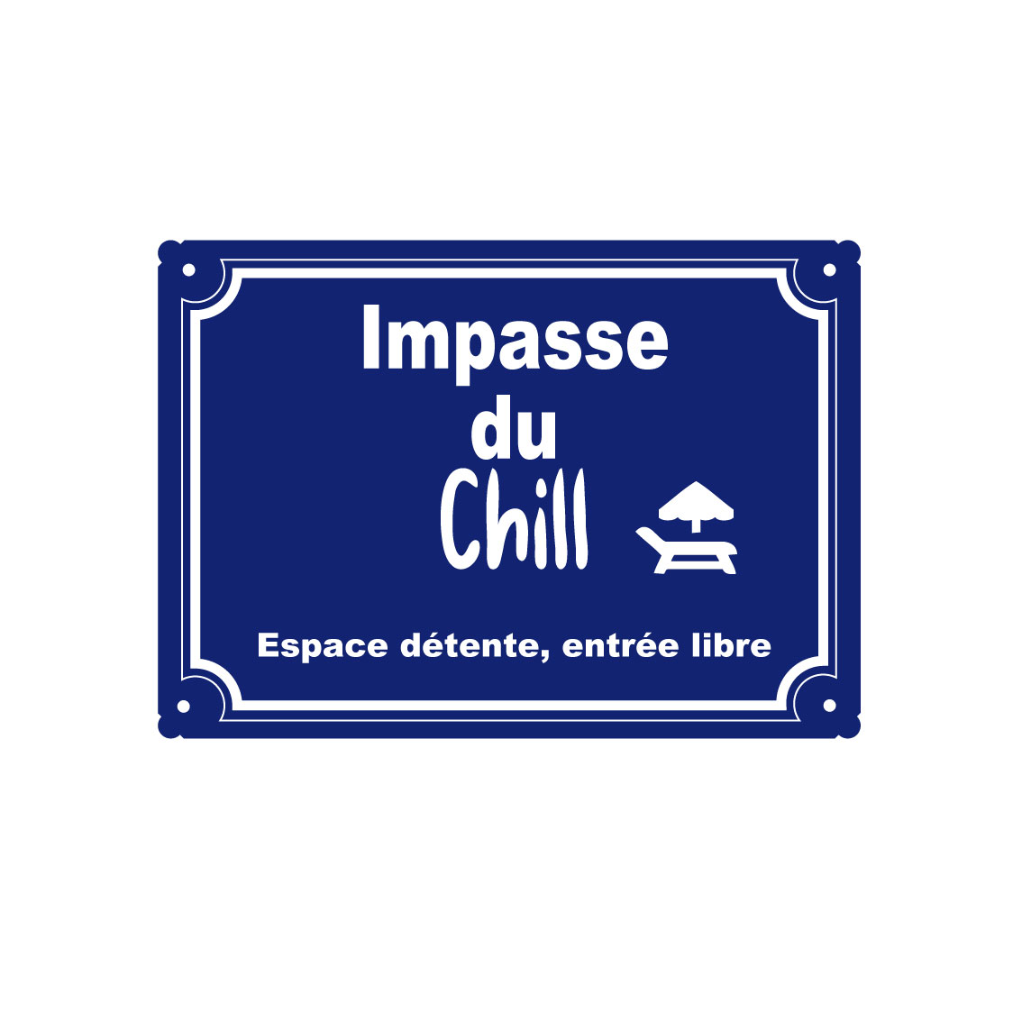 Plaque métal humoristique. Impasse du chill. Espace détente, entrée libre.