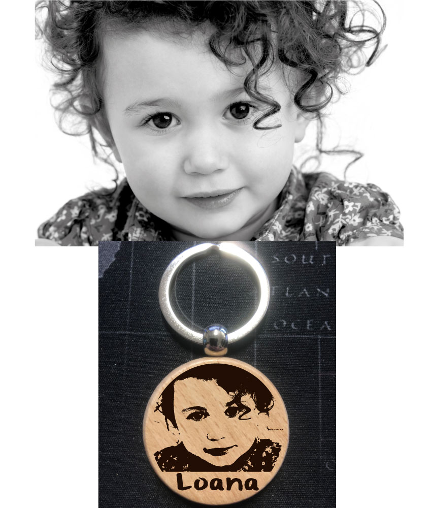 Porte clé en bois de qualité avec la photo de votre choix gravée avec le prénom