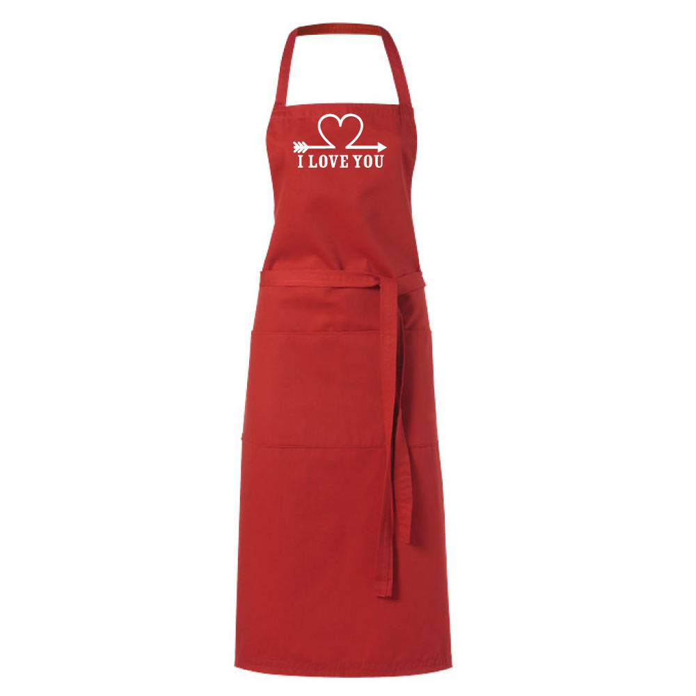 Tablier rouge avec écrit I love you* avec au dessus une flèche qui forme un coeur en blanc.