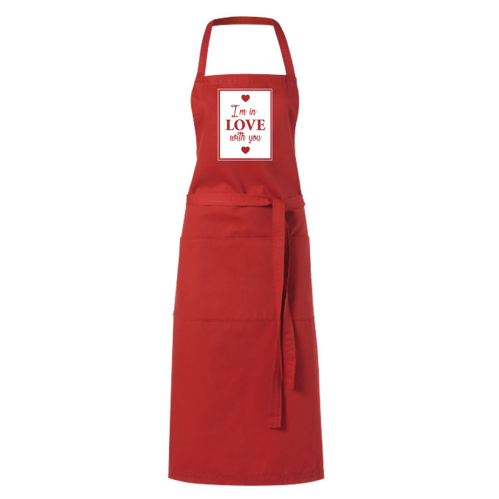 Tablier rouge avec écrit I'm in love with you* dans un carré avec daux coeur en blanc.