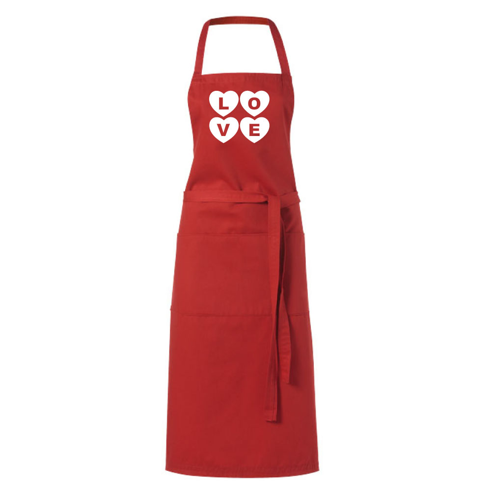 Tablier rouge avec écrit love* avec chaque lettres dans un coeur en blanc.