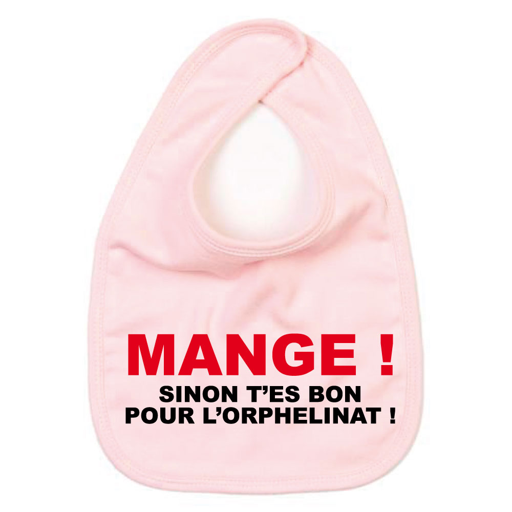 Bavoir humoristique pour bébé "Mange ! Sinon t'es bon pour l’orphelinat" rose - Cadeau de naissance - cadeau d'anniversaire bébé - cadeau humoristique