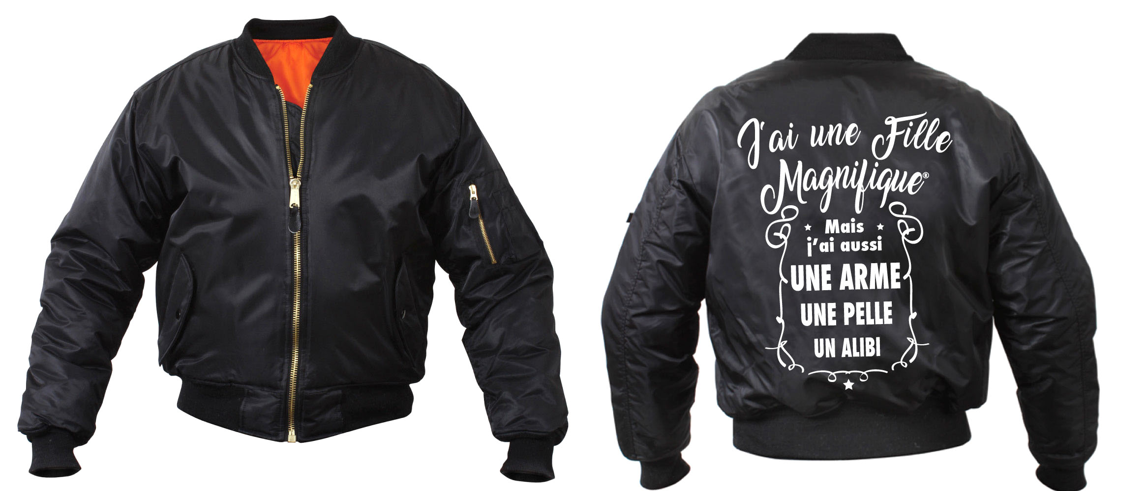 Blouson bomber noir j'ai une fille magnifique, j'ai aussi une arme, une pelle et un alibi