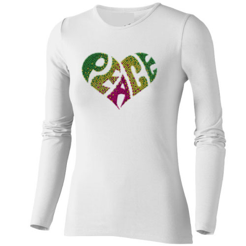 T-shirt blanc peace, écriture du mot peace et en ( vert jaune rouge jaune vert ) en forme de cœur