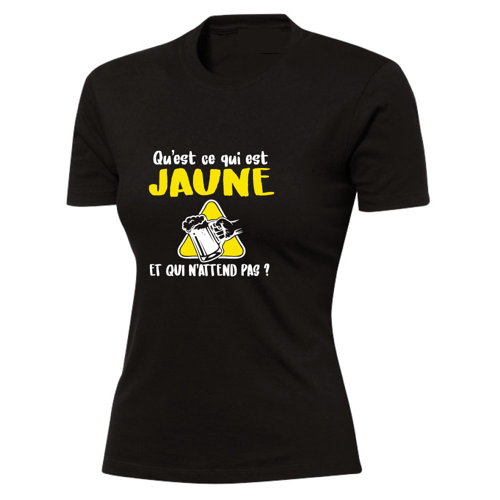 T-shirt femme noir humoristique "Qu'est ce qui est jaune et n'attend pas ?"