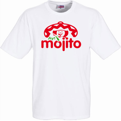 t-shirt blanc mojito, écriture rouge et dessin rouge et un morceau vert