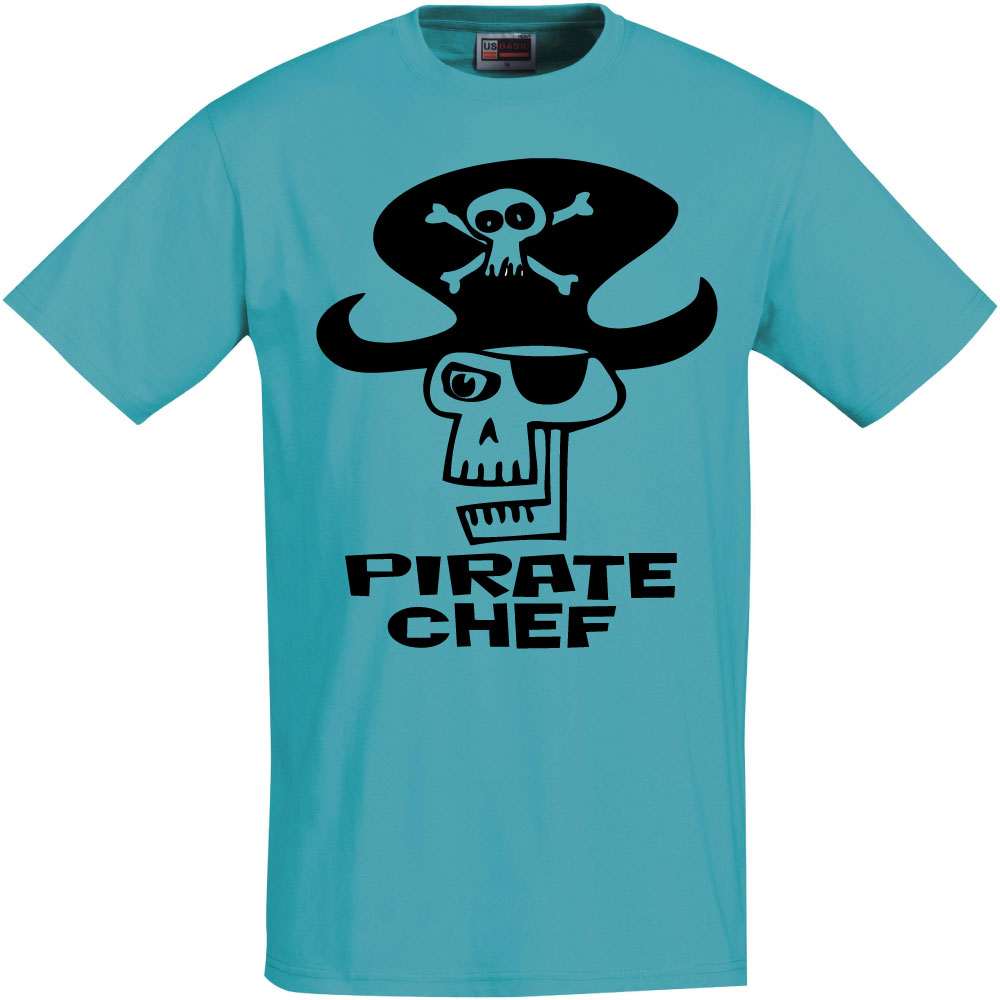 t-shirt bleu pirate chef, dessin et écriture en noir