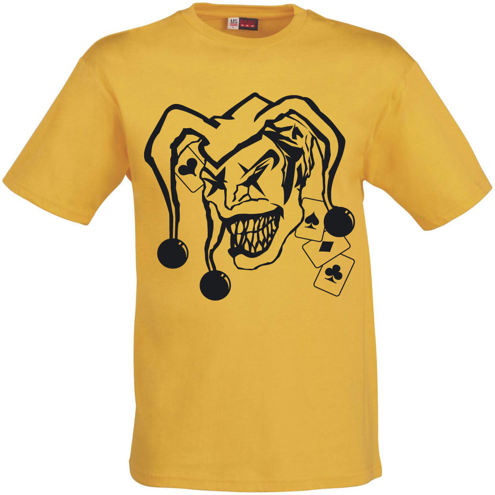 t-shirt jaune jocker, dessin en noir en fond il y a des carte ( as, pique, trèfle, cœur )