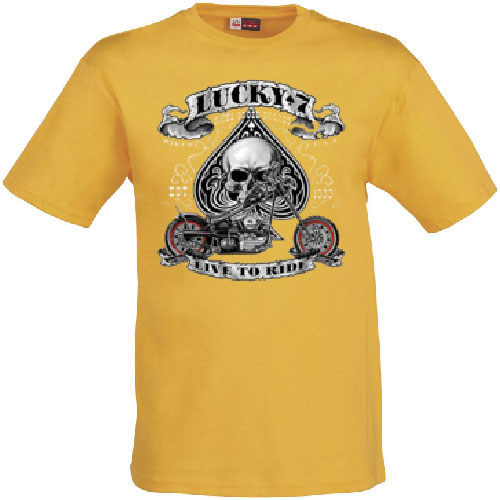 t-shirt jaune lucky 7, image en couleur, tete de mort dans une forme de pique et une harley