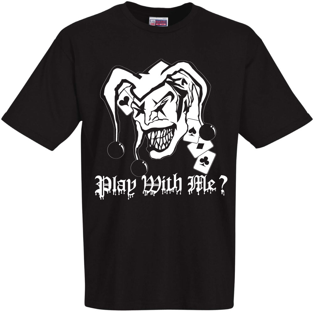 t-shirt noir jocker, dessin en noir en fond il y a des carte ( as, pique, trèfle, cœur ) écriture blanche