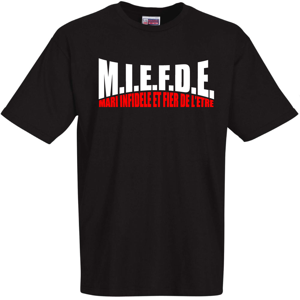 t-shirt noir M.I.E.F.D.E, mari infidèle et fier de l’être, écrit en rouge et blanc