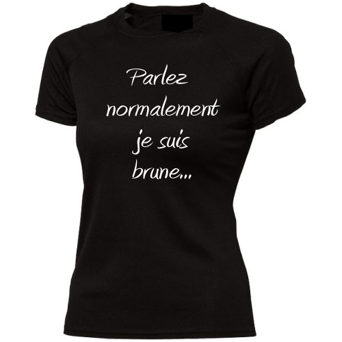T-shirt noir Parlez normalement je suis brune, écriture blanches format moyen placées sur tout le torse