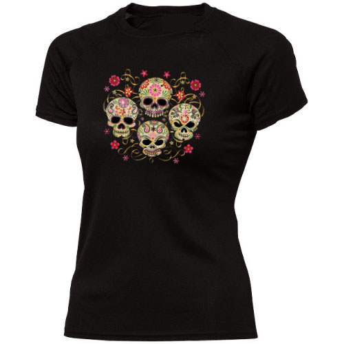 T-shirt noir skull flowers, quatre tète de mort mexicaine