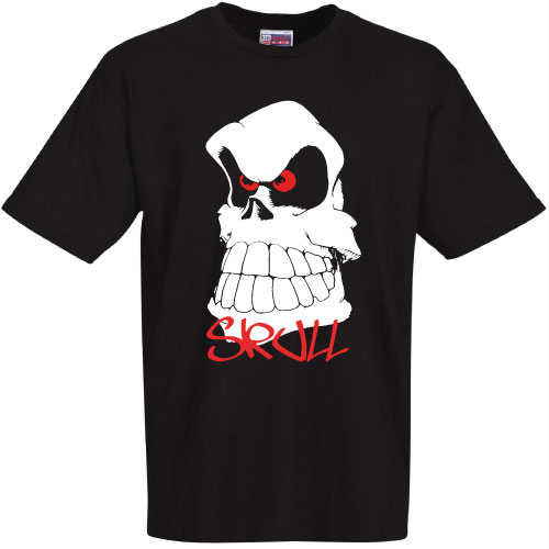 t-shirt noir skull rire, tete en blanc yeux et écriture en rouge