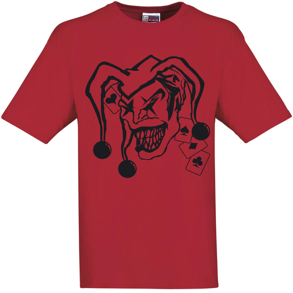 t-shirt rouge jocker, dessin en noir en fond il y a des carte ( as, pique, trèfle, cœur )
