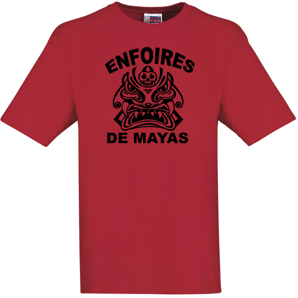 tee shirt rouge avec écrit "enfoirés de mayas"