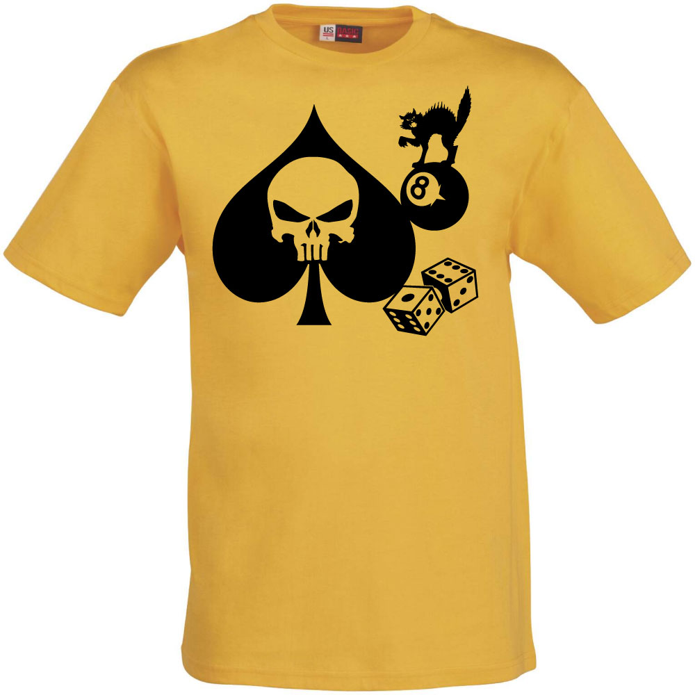 Tee shirt jaune manches courtes pique tête de mort, jeu de dés, chat méchant