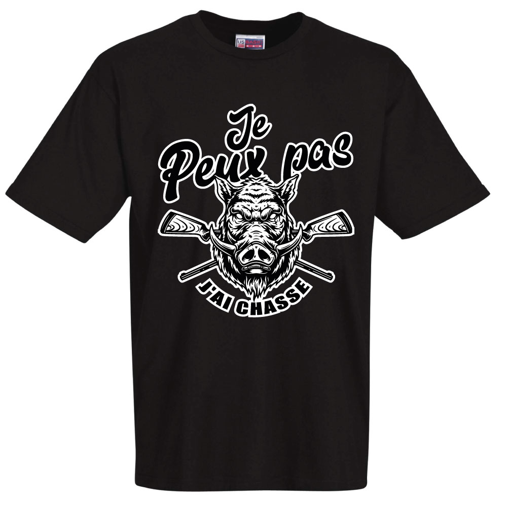 T-shirt humoristique noir "Je peux pas j'ai chasse" en version chasseur