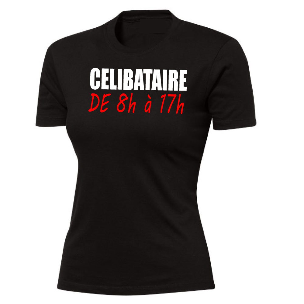 Tee shirt femme noir en manches courtes femme humoristique Célibataire de 8h à 17h
