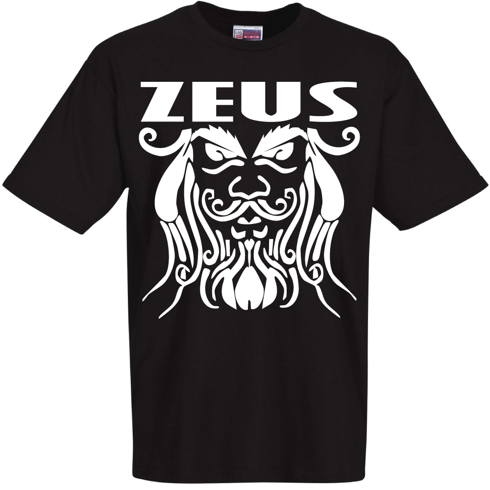 t-shirt noir zeus, ecrit en blanc et dessin sur le ventre en blanc aussi