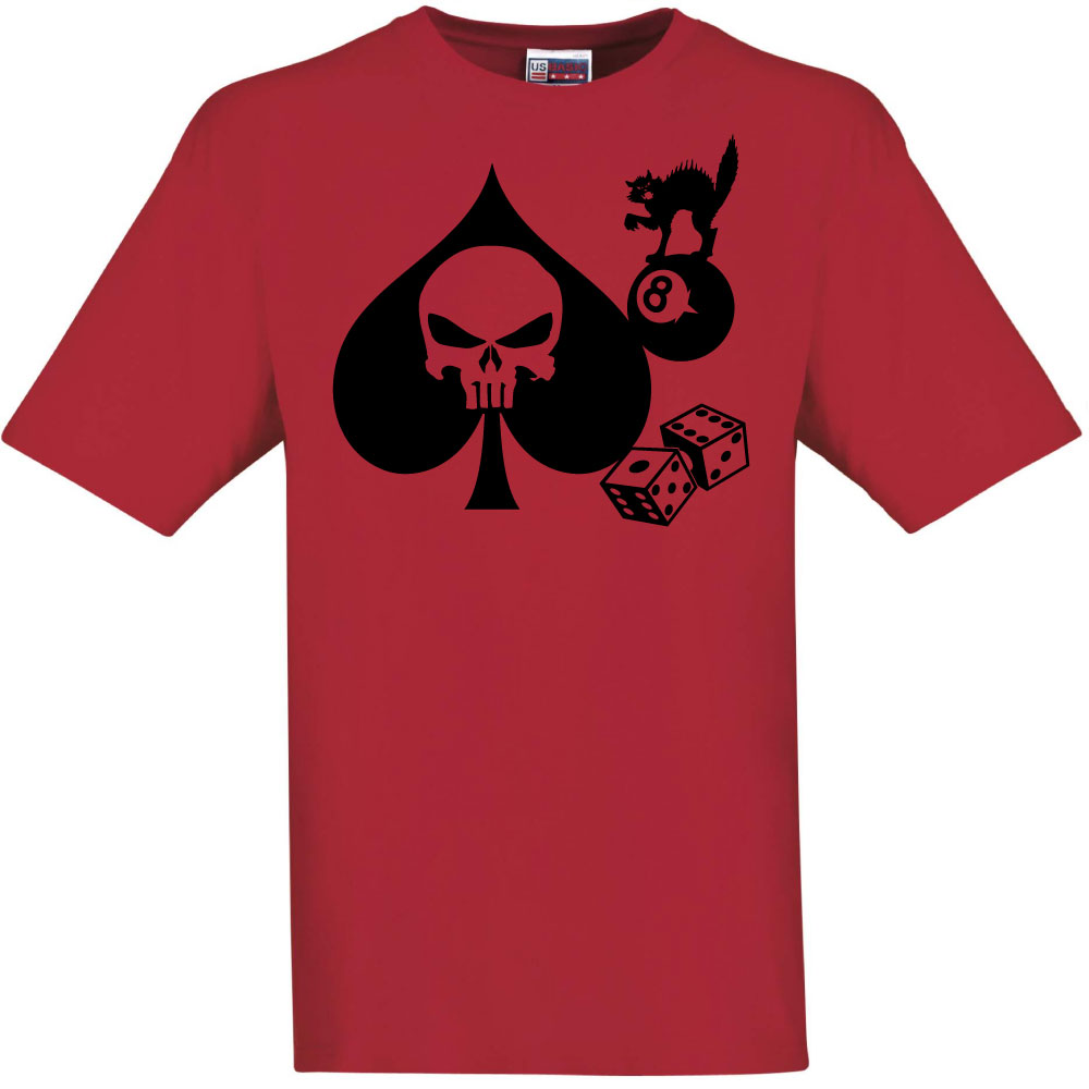 Tee shirt rouge manches courtes pique tête de mort, jeu de dés, chat méchant