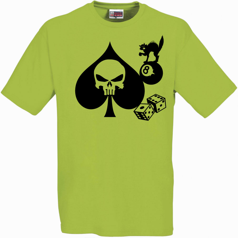 Tee shirt vert pomme manches courtes pique tête de mort, jeu de dés, chat méchant
