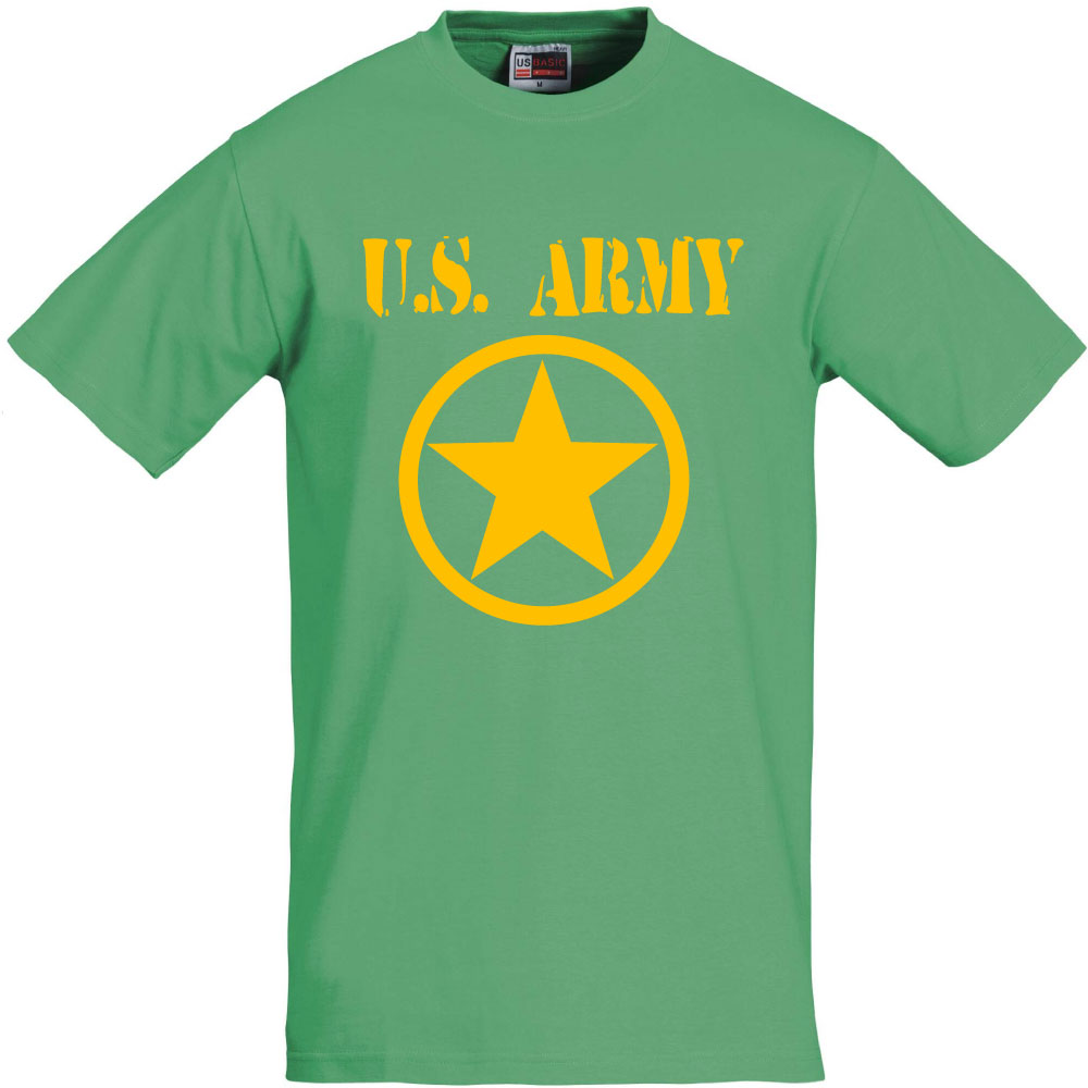 t-shirt vert us army, écriture jaune et une etoile jaune