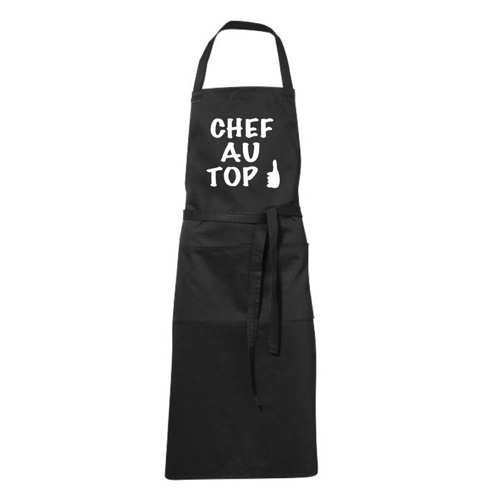 Tablier noir écrit chef au top avec un pouce en l'aire en blanc.