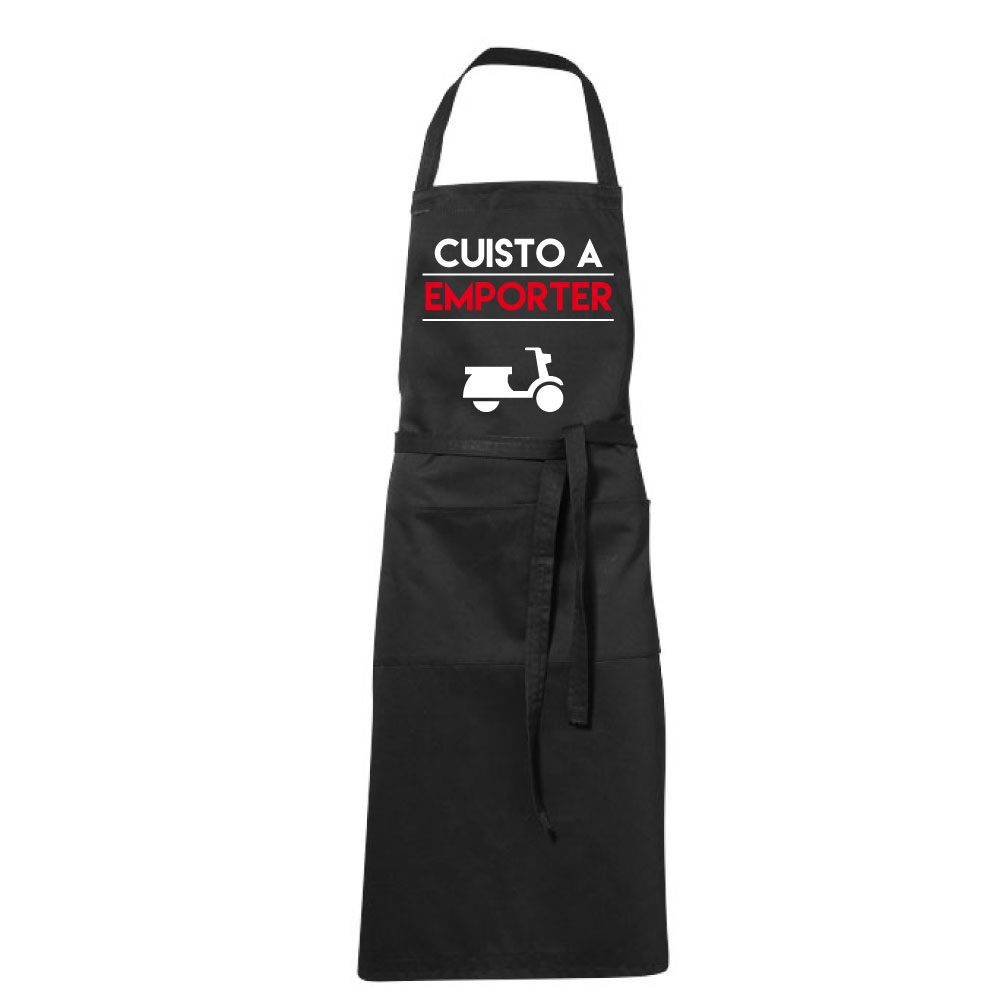 Tablier noir écrit " cuisto à " avec une mobylette en blanc et emporter en rouge.