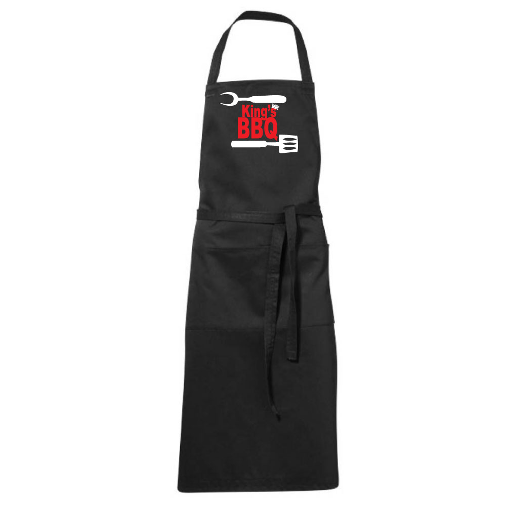Tablier noir écrit king's bbq en rouge avec deux ustensiles de cuisne en blanc et une couronne en blanc.