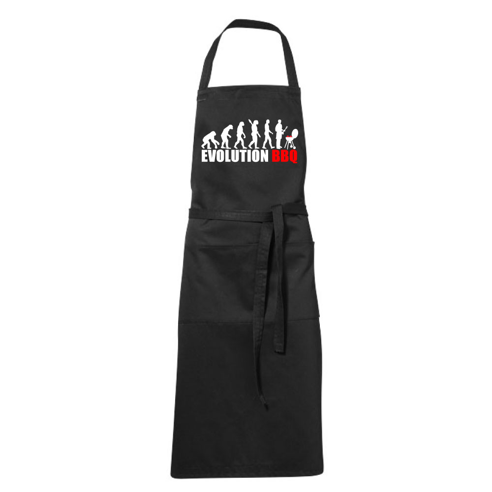 Tablier noir écrit évolution bbq en blanc et rouge, avec l'évolution humaine jusqu'à un chef barbecue.
