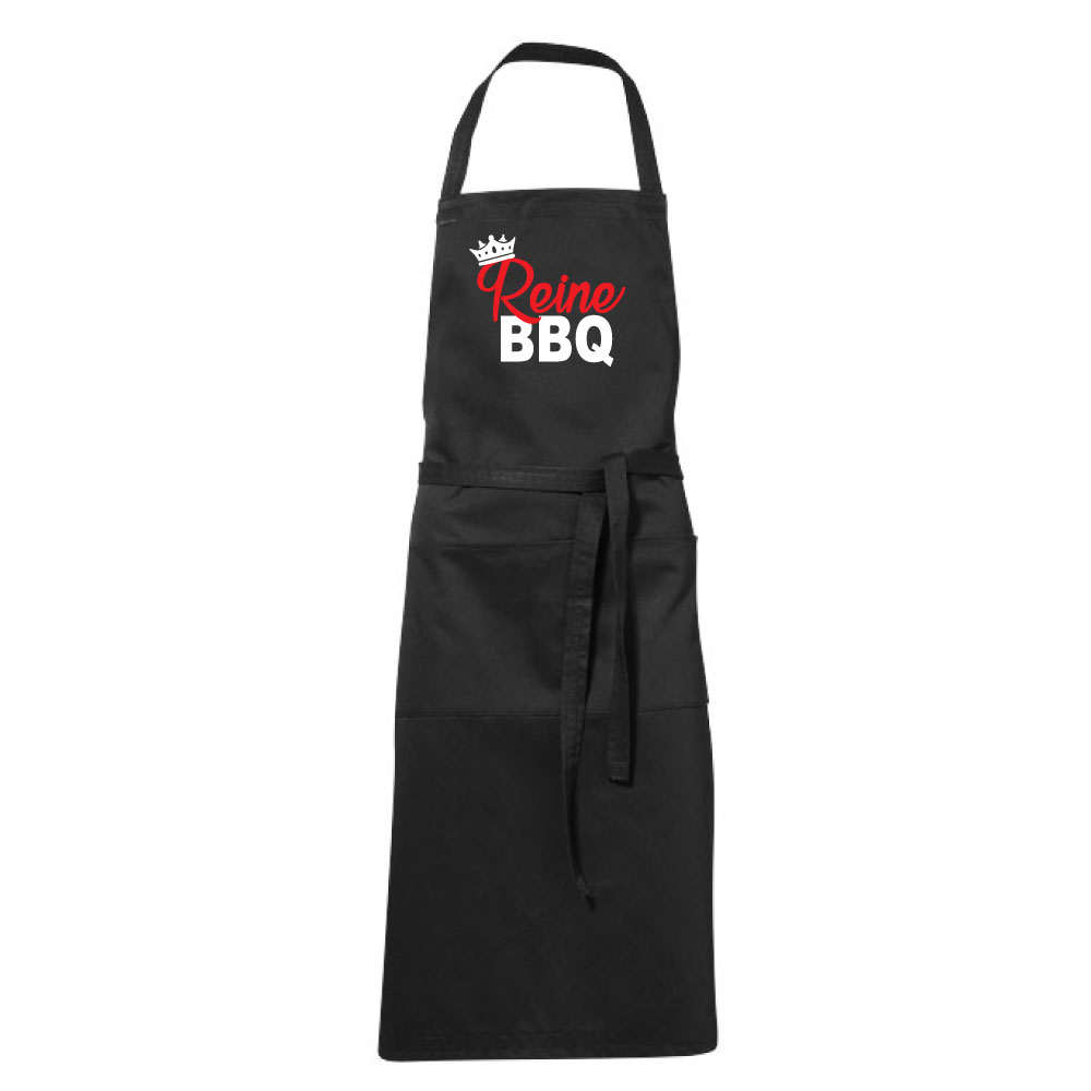 Tablier noir écrit reine bbq en rouge et blanc avec une couronne en blanc.